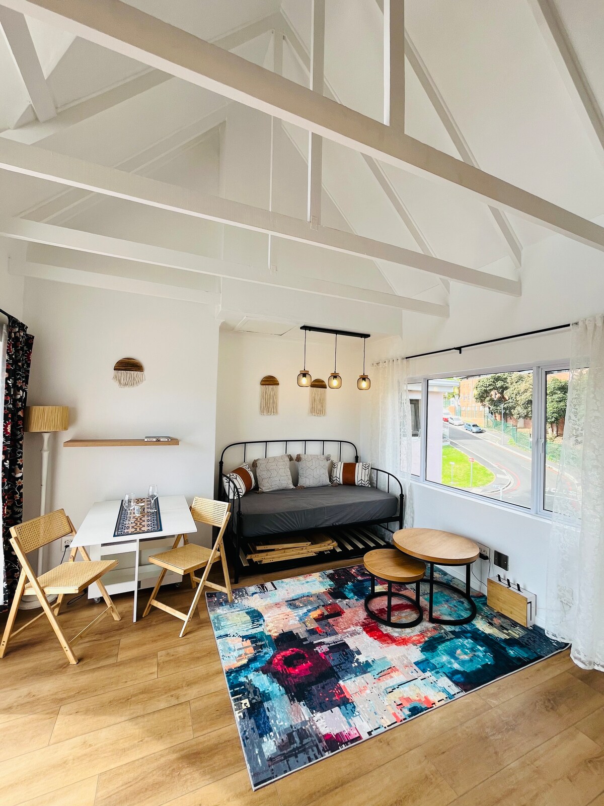 Tag på ferie i vores 3-etagers Airbnb med 2 soveværelser. Den er skræddersyet til to og kombinerer ro og byliv, hvilket er perfekt til fjernarbejdere eller feriegæster, der søger en mindeværdig ferie. Slap af på tagterrassen, der kun er til privat brug, med en jacuzzi og en fantastisk udsigt over bjergene og havet. En fælles pool giver mulighed for en forfriskende afkøling på varme sommerdage. Nyd nærheden til faciliteter som shopping, yogastudier, trendy restauranter og det bedste af byens attraktioner, Table Mountain og V&A Waterfront.