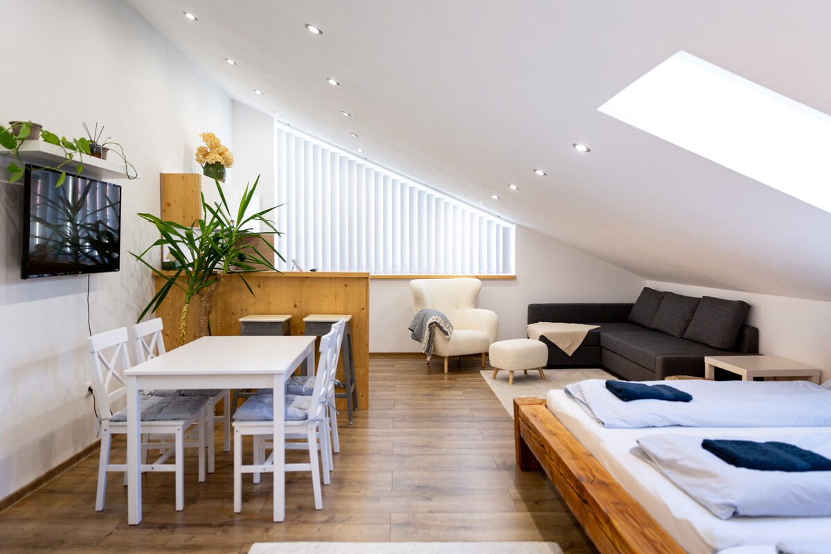 Studio med eget privat badeværelse til to gæster. I et rum er der en stue med tv, køkken og spisebord, der er adskilt af en skillevæg fra soveområdet med dobbeltseng. Fra værelset kan du få direkte adgang til terrassen med siddepladser gennem en stor skydedør. En meget populær indkvarteringsmulighed i Tatra-bjergene for to gæster.