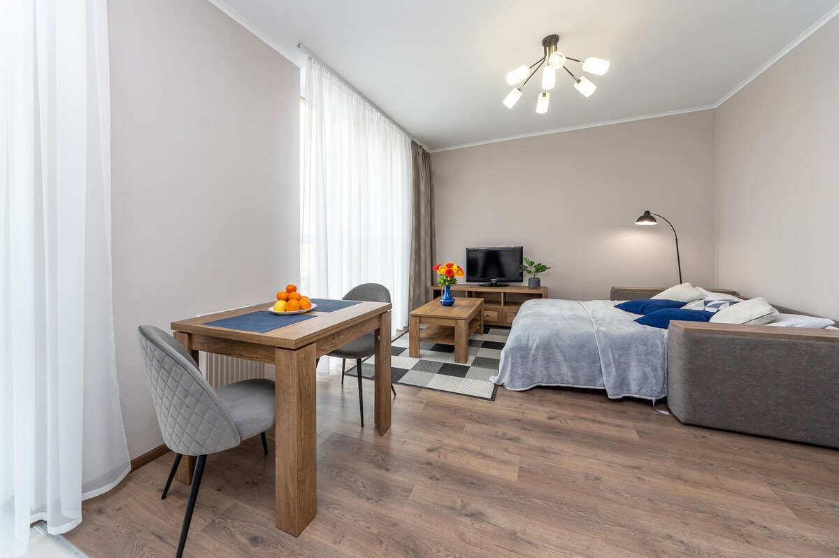 Комфортна студія на 4 спальних місця. WiFi Смарт TV Кондиціонер Тепла підлога Балкон Барна стійка Газова плита Духова шафа Мікрохвильовка Посуд Білизна Рушники Пральна машина Фен Праска Гарний двір Закрита територія під охороною Заїзд цілодобово