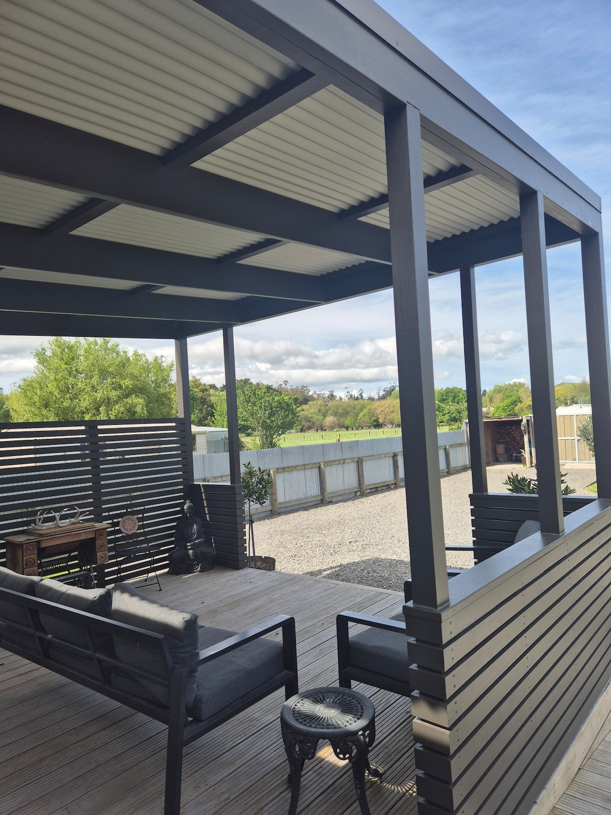 En rolig, afslappende selvstændig enhed, der er adskilt fra hovedhuset, beliggende i udkanten af Waipawa. Nyd en drink på terrassen med udsigt over haven, og lyt til fuglesangen. Det er kun 10 minutters gang til butikker, caféer, teater og er praktisk til cykelstierne i Central Hawkes Bay. Strandene og Ruahine Ranges ligger ikke langt væk, og det er kun 30-40 minutters kørsel til Hastings eller Napier.