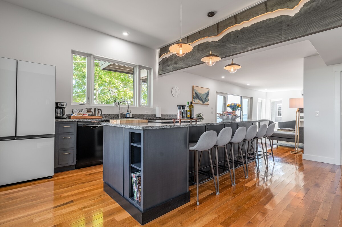 Denne nybyggede 850 kvadratmeter store hytte har en væg af vinduer og ligger i en 30 hektar stor skov. Det er perfekt for dem, der søger et fredeligt og hyggeligt sted at slappe af og trække vejret dybere, mens de oplever Mid-Coast Maine. Vågn op til den blide morgensol, der stiger over træerne, ophold dig om natten under magien og mysteriet i en stjernefyldt himmel, og oplev, hvad alle fire årstider har at tilbyde. Belfast og Unity ligger tæt på Bangor, Camden, Rockland og Acadia - nemme dagsture.