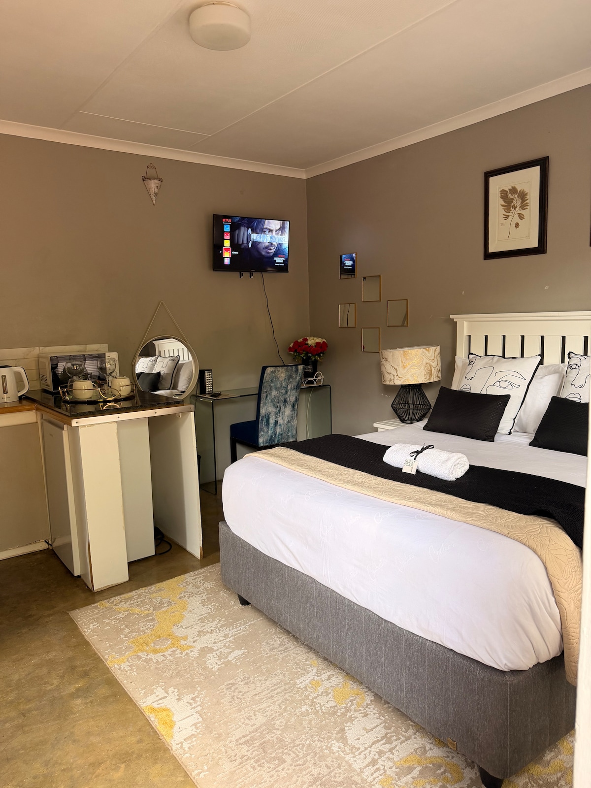 En smuk, sikret og bekvemt beliggende lejlighed i nærheden af en række kulturarvssteder, uddannelses- og sundhedsinstitutioner, fantastiske spisesteder og underholdningsmuligheder, fantastiske sportsfaciliteter og attraktioner. Denne luksuriøse rummelige lejlighed med et soveværelse er stilfuld med moderne finish, bestående af veludstyret køkken med køkkenredskaber, queensize-seng, et fladskærms-smart-tv med adgang til Netflix og Showmax, ubegrænset gratis Wi-Fi og BACK UP POWER under strømafbrydelser.