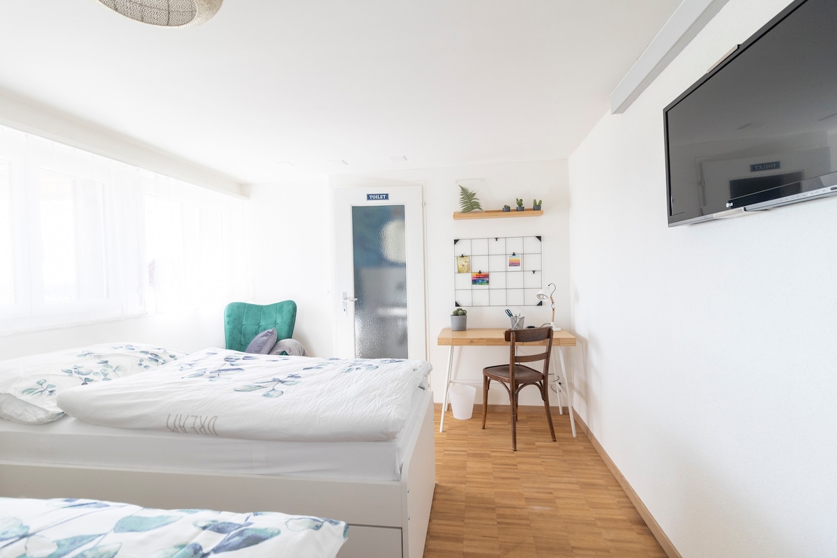 Vores lille studielejlighed, der blev renoveret i juli 2020, ligger i et roligt boligområde i en idyllisk beliggenhed i udkanten af Rüfenacht. Der er en parkeringsplads lige ved huset. Offentlig transport i umiddelbar nærhed (5 minutters gang). Byen Bern ligger omkring 8 km væk. De smukke ski- og vandrerområder i Berner Oberland er let tilgængelige.