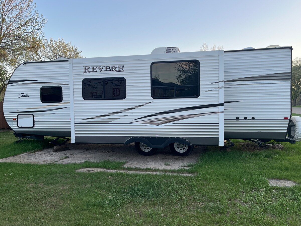 2014 Shasta Revere 27ft Bunk House Travel Trailer til leje. 1/2 kan bugseres. 6097 tørvægt. Op til 8 personer (queensize-dobbeltseng + sofa, der kan foldes ud + spiseplads, der kan laves om til en queensize-dobbeltseng + hjørnekøjesenge) Mindst to nætter