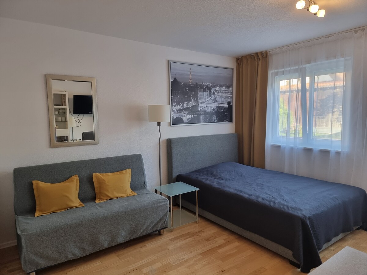 Hej kære gæster, vi tilbyder jer et studie med brusebad, toilet og sauna. Værelset har: - dobbeltseng + enkeltseng - TV med HDMI, USB-porte (muligt for harddiske med film) - Garderobeskab - kogeplade - Mikrobølgeovn med varmluftsovnfunktion - El-kedel - Kaffemaskine - Køleskab - Sauna - Have Overfor ligger et supermarked (Rewe mandag - lørdag åbent til kl. 22) og en bager i Rewe, der også sælger friske boller om søndagen.