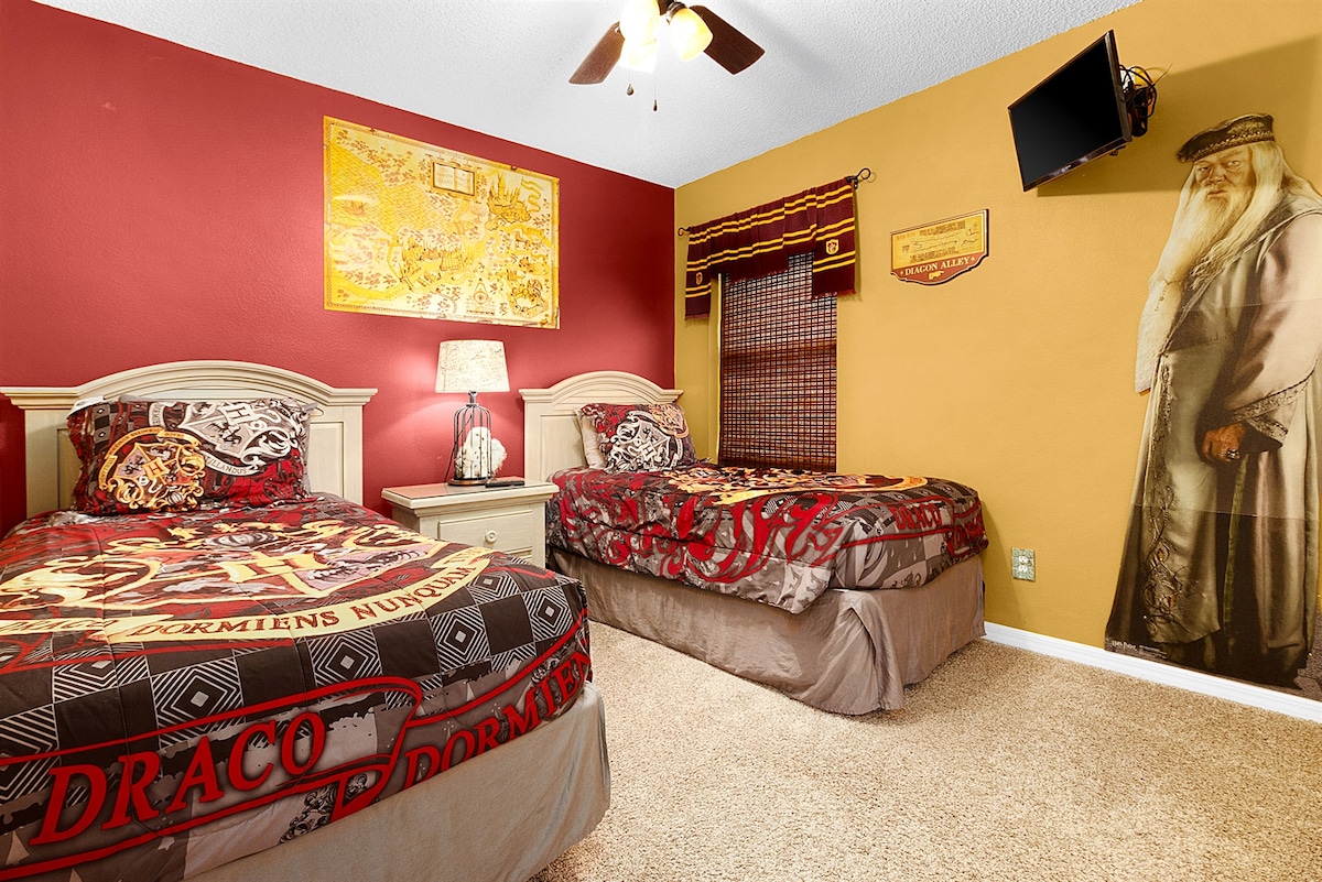 ✨ Træd ind i dit eget Disney-eventyr! Denne villa, der engang var en NBA-stjernes feriebolig, har plads til 23 personer og blander luksus med sjov: • 🛏 Temasoveværelser (Frost, Biler, Harry Potter, Star Wars og mere) • 🎬 Galaktisk teater med 86" skærm, surround sound, arkade, Xbox og Nintendo • 💦 Opvarmet pool og spa med loungeområde + fredfyldt skovudsigt • 🎢 Resort vandlande med lazy river, piratskib, vandrutsjebaner og minigolf • 📍 Prime Location: Kun 7 miles til Disney & 19 miles til MCO seværdigheder