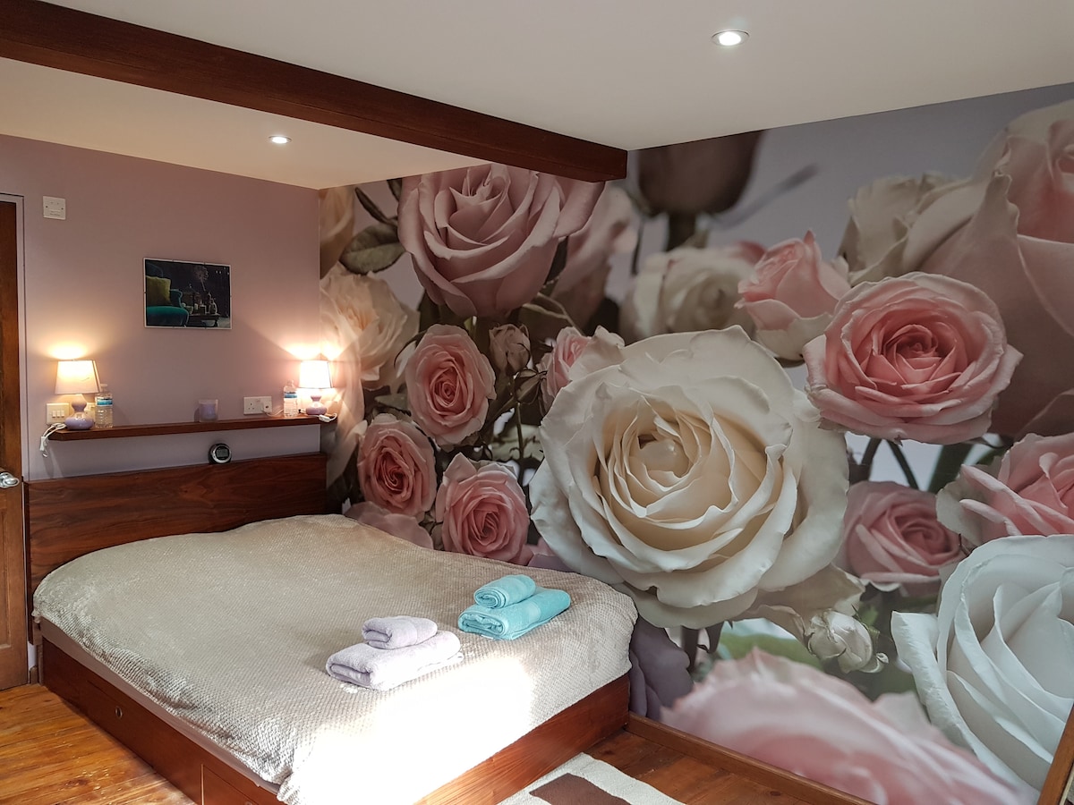 Kom og lad op i det smukke grønne Clapton, hvor du kan gå til butikker og restauranter. Min havelejlighed er fuld af kunst og har et fuldt udstyret køkken, der er perfekt til et par, der vil slappe af, lave mad og læse. Soveværelset er fuldstændigt spejlet og har en XXL-madras. Spiseområdet åbner op til den private baghave med plads til at spise. Badeværelset har et dybt japansk terningformet badekar, der passer til to personer. Der er en projektor og et lærred til film. Badeværelset, spisestuen og køkkenet har gulvvarme