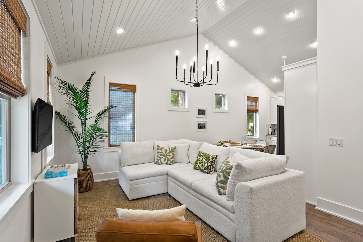Beach House støtter op til en enorm statslig skov fyldt med vandrestier/cykelstier og dyreliv. Gå, cykle eller tag en 6-sæders golfvogn (ekstra gebyr) til stranden, eller gå ud af bagdøren til en fantastisk kystnær fyrreskov. Adgang til nabolagets swimmingpool! Smukt indrettet med alle faciliteter: udendørs opholdsområde med en pejs og en afskærmet veranda, en grill, cykler til voksne og børn og et loft på 3. sal. 30A landsbyer i Grayton Beach, Seaside, Alys og Watercolor ligger en nem cykeltur eller 5 minutter i bil derfra.
