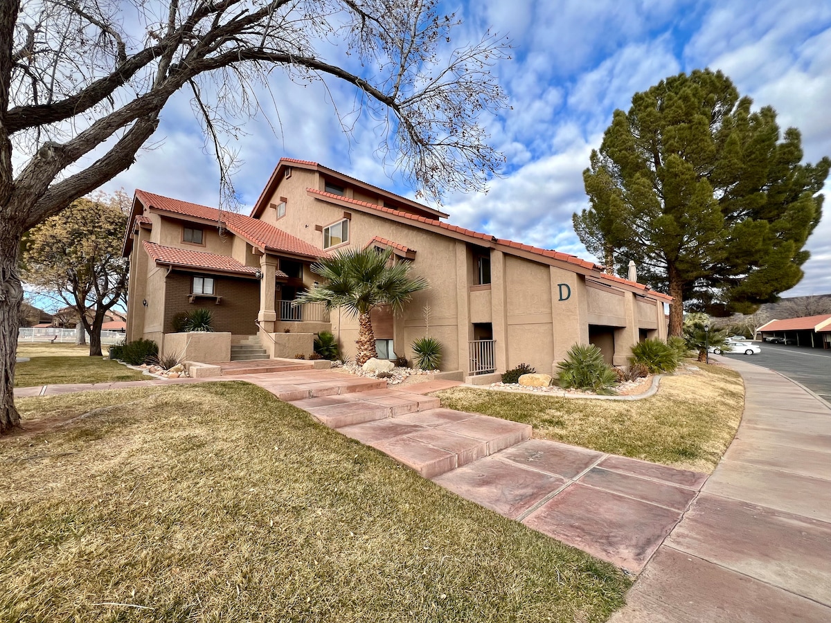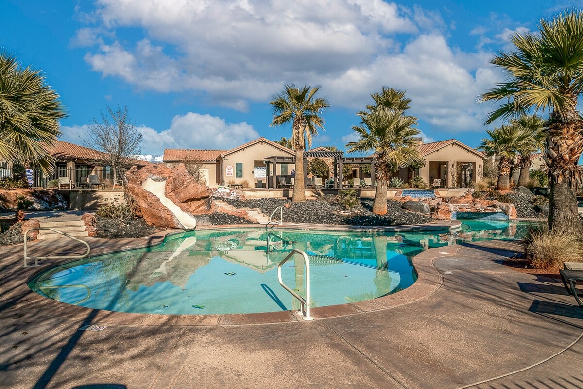 Book ikke et sted langt ude i ødemarken! Ved siden af Las Palmas. Book vores moderne lejlighed i stueetagen på hjørnet uden trapper og masser af vinduer! We are next to state parks, (Zion) Tuacahn Theatre, Walmart, Bear claw poppy trailhead for hiking/bike trails, 100mi UTV Riding and we are also next to The Grip Fitness - Ninja Warrior Obstacles and a Spa! Vores lejlighed er i stueplan, så du har en stor terrasse, der ligger mellem palmer. Gå ud bagved til et græsareal! Fiber Wifi, luksuriøs massiv pool/badekar Pickleball