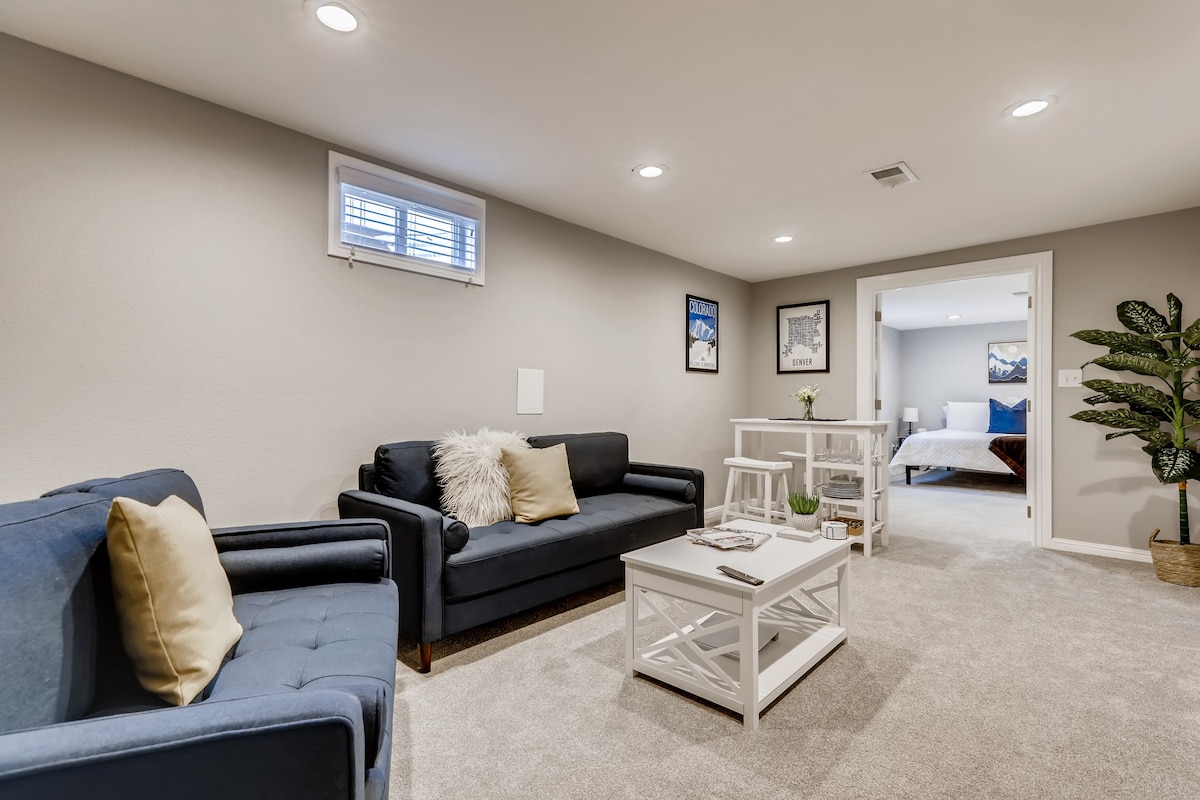 Kom og bo i denne nyrenoverede kældersuite få minutter fra downtown Denver, Coors Field, Mile High Stadium, Highlands og RiNo-kvarteret. Denne centralt beliggende bolig ligger lige ved både I-25 og US-36, mindre end 30 minutter fra Boulder og Red Rocks! Den private suite med et soveværelse er rummelig og hyggelig. Den er udstyret med en kaffebar og spiseplads, et kontorlokale til hjemmearbejde, et smukt badeværelse med brusebad og en terrasse/baghave med bålplads og masser af siddepladser.