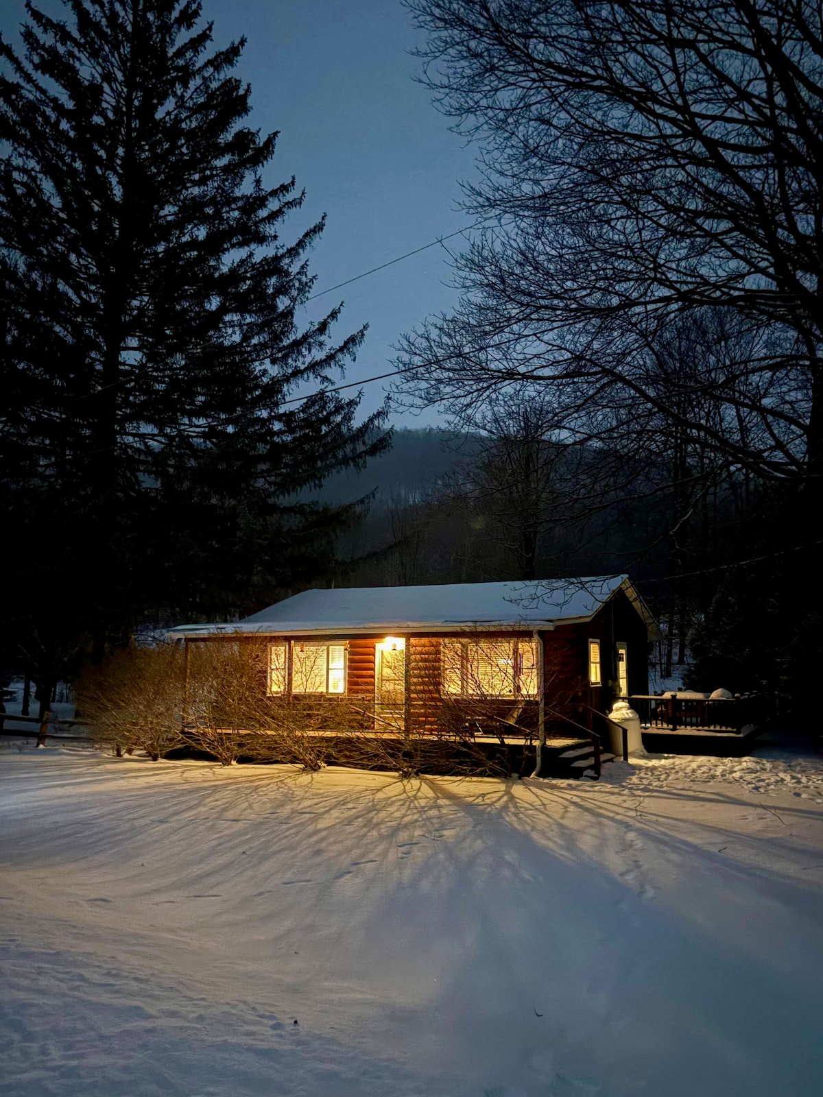 Tag til vores rummelige vinterhytte, der ligger omgivet af en fredelig skov og ofte er dækket af sne, med varm feriedekoration indenfor. Nyd hyggelige siddepladser indendørs og udendørs, et spabad i et privat lysthus, en veranda, en hængekøje og et knitrende bålsted til stjernenætter. Indenfor venter et åbent opholdsområde, spil og komfortable soveværelser. Få minutter fra søde restauranter, skiløb, søer og stier – perfekt til afslapning og til at nyde Poconos charme.