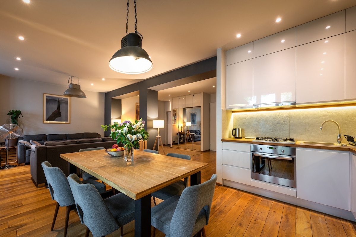 Dyk ned i Krakow's Old Town fra denne toetagers penthouselejlighed. Genopliv i et lyst, airconditioneret og eksklusivt interiør. Nyd en friskmalet kop kaffe, og beundr byens panorama med historiske bygninger fra en af to private tagterrasser. Dette rum er helt unikt, ligesom den udsigt, det giver. BEMÆRK: I vores lejlighed er det strengt forbudt at organisere nogen form for fester/særlige begivenheder.