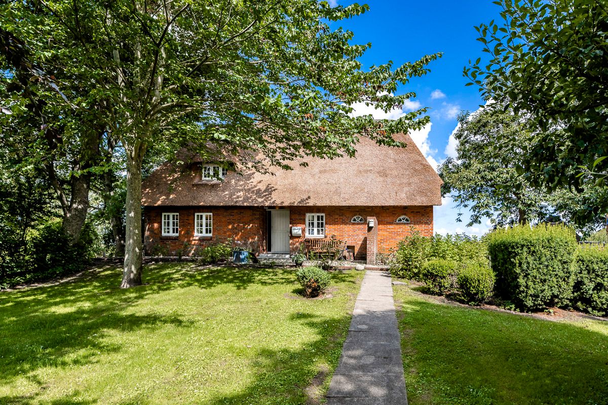 Reetdachhaus inmitten von Wiesen und Feldern