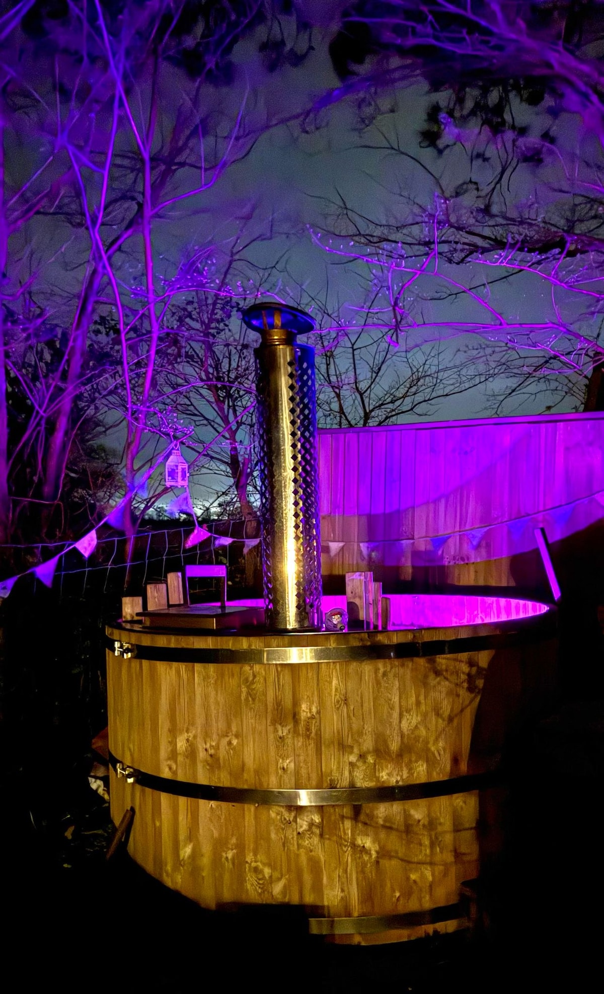 Poppy-teltet har en ordentlig dobbeltseng Minikøleskab Elektriske lamper og lyskæder i den. Enkelt futon Elopladningsstationer Tæpper Taffelys Tekaffesukker Gaskomfur med dobbeltbrænder små gryder og pander og komfurkedel. Dejlig badekar med bruser, vask og et komposteringstoilet (rengøres efter behov) Pizzaovn udenfor Picnicbænk Grill Bålplads Trækul tændstikker til rådighed 🌼🌼Boblebad opkræves 30 £ per ophold🌼🌼 betalt via air bnb ekstra tjenester