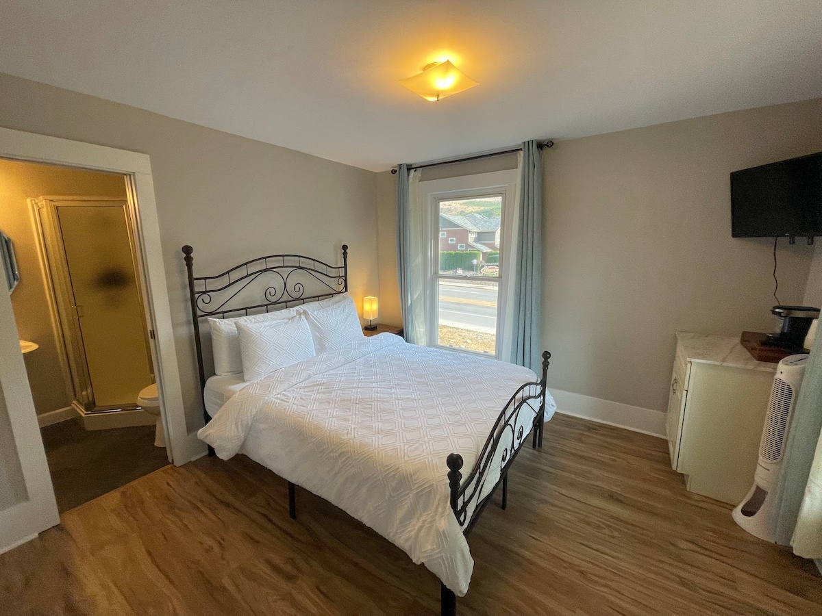 Welcome to the historic Lake Chelan Manor! This beautifully remodeled private room features a queen bed and ensuite bath. Walk to the lake, downtown, Riverwalk Park, and Pingrey Park. This is a private guest room in a shared building—like a boutique inn—so you may see other guests in shared areas. Coffee bar, mini-fridge, and TV included for your convenience. Max 2 guests. Ideal for couples or solo travelers seeking comfort and convenience in the heart of Chelan.