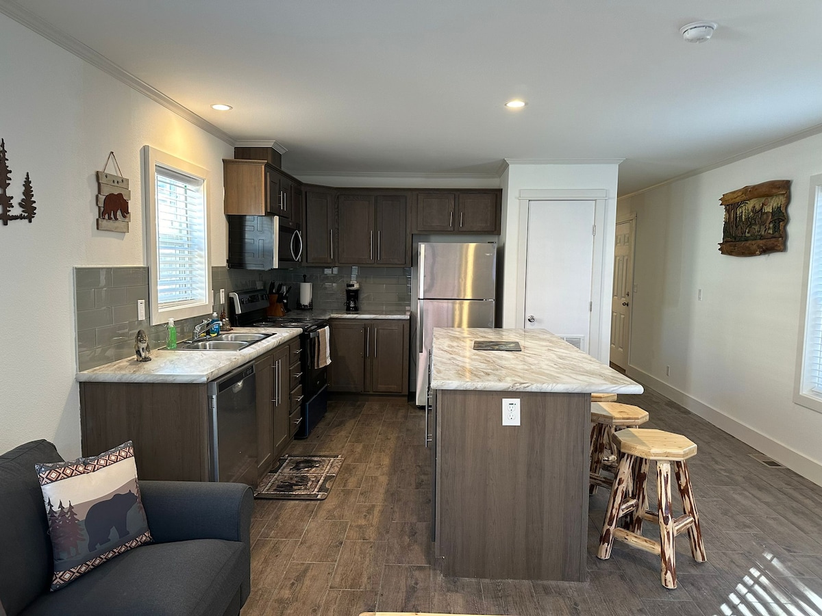 Vores hytte i nærheden af Yellowstone er fuldt udstyret med alle de faciliteter, du har brug for til et behageligt ophold. Du vil elske den rustikke, men moderne stemning, der kommer fra trælofter og trim, håndlavede møbler og bordplader i granit. Hytten har to queensize-senge, en kingsize-seng i Californien og to komplette badeværelser. Denne hytte er børnevenlig og let tilgængelig fra Highway 20. Der er rigelig parkering, og vi har også rampeadgang til dem, der ikke kan bruge trapper.
