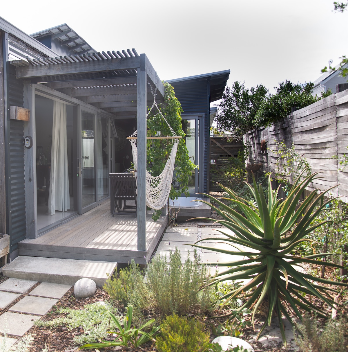 Velkommen til vores charmerende atelierhavelejlighed, din ideelle kystferie i hjertet af Jeffreys Bay! Oplev denne hyggelige oase, der ligger en vej tilbage fra stranden, designet til både surfentusiaster og strandelskere. Et backup-system med solcellebatteri betyder, at der ikke er strømafbrydelser. INGEN STRØMAFBRYDELSER Nyd en kort gåtur til de berømte surfbølger eller en romantisk gåtur til lagunen, eller vælg at slappe af på verandaen, nedsænket i symfonien af havets ro. Dit feriested ved havet er et klik væk.