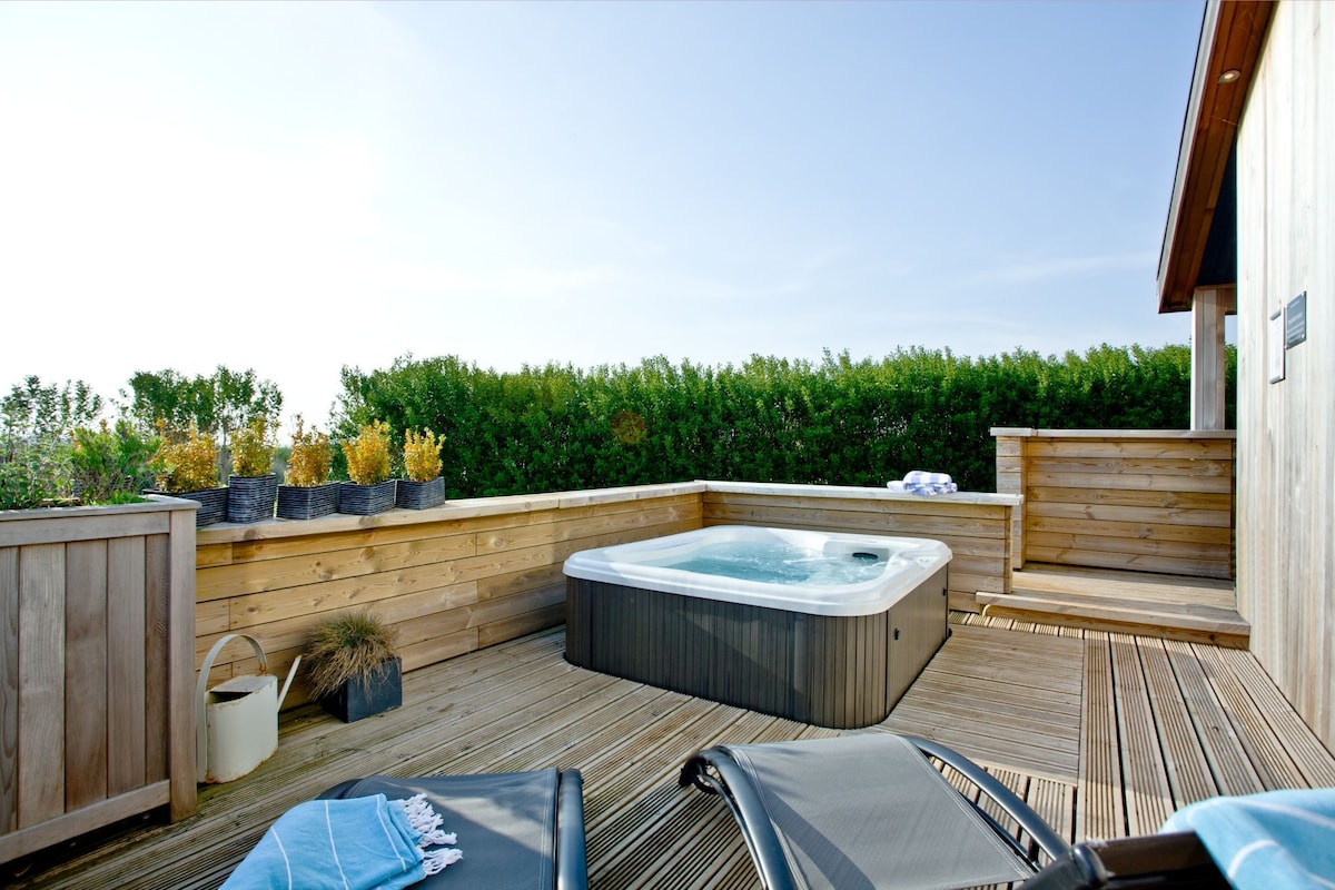 Woodside Lodge - er en ekstraordinær lade, der er designet af en arkitekt. Beliggende ved indgangen til omfattende privat skov, samtidig med at den er beliggende inden for vores egen 2 hektar smukke haver. Vi skabte denne fantastiske hytte med dens store vinduer, katedral-loft og luksuriøse faciliteter. Vi sørgede for, at vi havde en topmoderne bolig, der ville tage vores gæsters åndeløse! Vi kunne have lavet to eller endda tre soveværelser ud af dette rum, men besluttede, at mindre var mere.