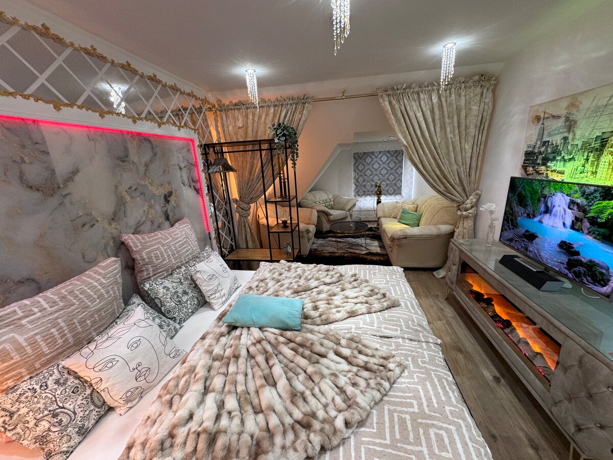 Luksusloft Herdecke DE BEDSTE OMTALER⭐⭐⭐⭐⭐ Nyd en stilfuld atmosfære, der er forberedt med opmærksomhed 💘 på detaljerne, og slap af som en 👑 konge. Unik oplevelse venter dig i denne centralt beliggende luksusindkvartering. Uanset om det er fra spabadet, køkkenet eller soveområdet, er der et tv til rådighed overalt, HD TV og Netflix, Magenta, Disney, Prime og YouTube. Du vil overraske nogen, intet problem, vi hjælper dig med at gøre denne dag speciel.