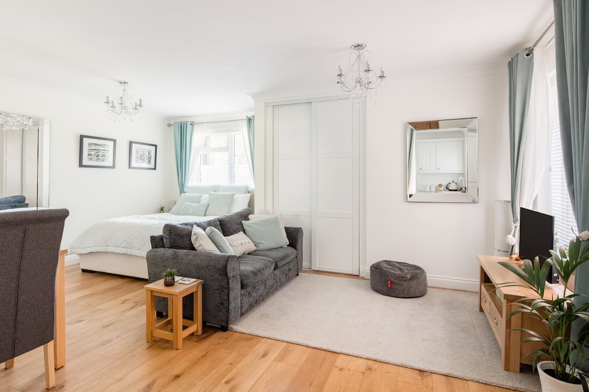 Slap af og nyd dit eget lyse og luftige logi i et roligt boligområde tæt på Downs og kun 20 minutters gang fra Guildford High Street. De franske døre fra stuen åbner ud til en privat terrasse med udendørs spisestue. Der er et fuldt udstyret køkkenområde med spisebord, et badeværelse med bruser og et soveværelse. En perfekt base til at udforske Surrey Hills eller RHS Wisley og kun 40 minutters kørsel til Heathrow eller Gatwick. Hurtig parkering til wi-fi og indkørsel. Opladning af elbiler kan bestilles mod betaling.