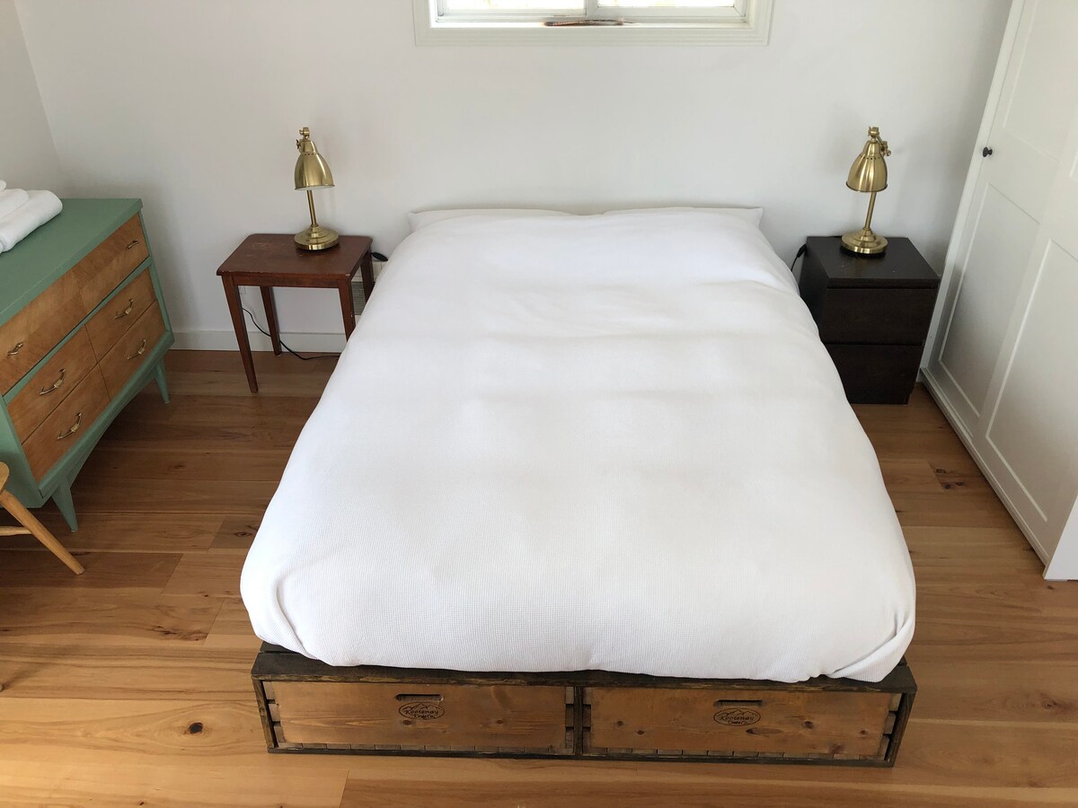 Jeg har forsøgt at skabe et behageligt rum, der giver en vidunderlig base for eventyr. Væggene er dækket af lokal kunst, jeg elsker at fremvise lokale håndværkere. Malerierne minder om Nelson og er til salg. Den smukke kingsize-seng og live edge træborde er taget fra bæredbart høstede træer og skabt af en lokal håndværker. Ovenpå er rummeligt og har en brændeovn. Nedenunder er et smukt grottebadeværelse med et nedsænket badekar, der er stort nok til to.