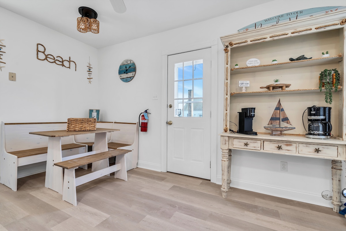 Slap af på 𝐂𝐚𝐬𝐚 𝐝𝐞𝐥 𝐌𝐚𝐫, et nyrenoveret strandhus med 2 soveværelser og 1 badeværelse kun 5 minutter fra Bayside Beach. Har en kingsize-dobbeltseng i det største rum, en queensize-dobbeltseng i det andet rum, walk-in-closets, fuldt udstyret køkken, 3 smart-tv'er, hurtig wi-fi, vaskeri, solrum og terrasse med gyngestole. Tæt på Cape May Lighthouse, vingårde, Wildwood-strande og Sunset Beach. Ideel til par eller familier. Nøglefri adgang + parkering i indkørslen. Se vores lokale guide til de bedste steder.