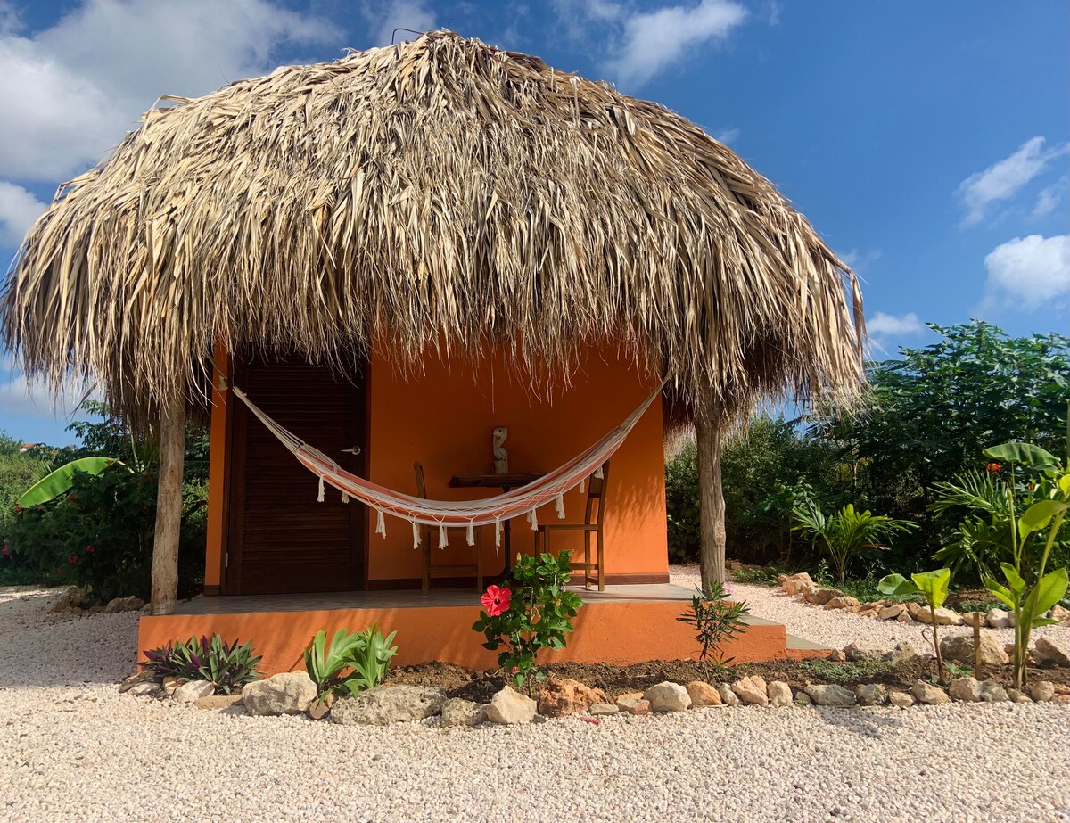 Laid out in an enclosed tropical garden with (palm) trees, exotic flowers, colorful birds, hummingbirds and butterflies. There is also a swimming pool (6 meters) with sun loungers, a jacuzzi and various seating areas. The domain is located by the sea, but there is no direct access. The idyllic beach Playa Wachi, where you can also enjoy snorkeling, is a 5-minute walk away. Tropical cabin with palm leaf roof, one bedroom, bathroom and shared kitchen. Part of the colourful eco-resort, De Octopus