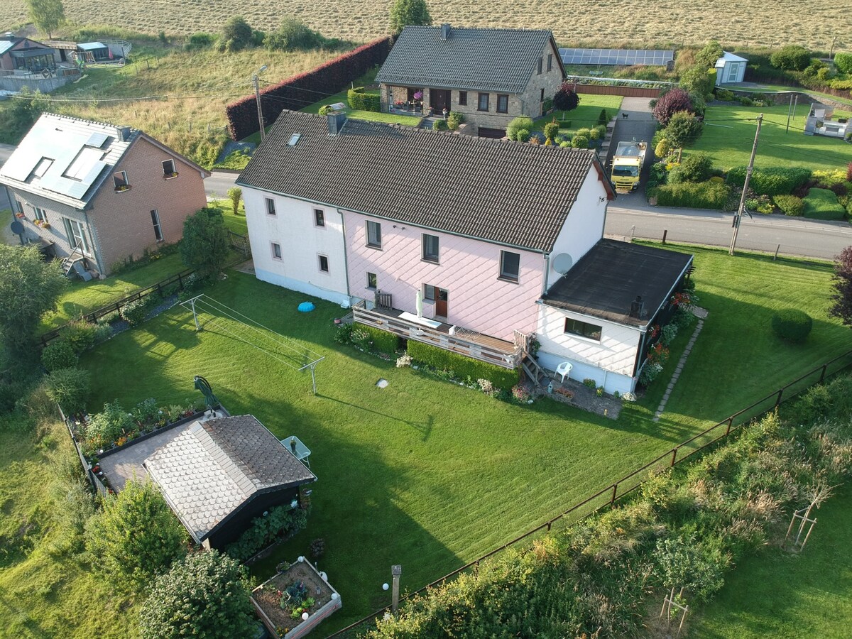 Grand bungalow situé dans un environnement résidentiel calme près de la ville (2 km) et ses commodités (e-station, magasins, restaurants, piscine, hôpital) Free wifi. Dans un cadre verdoyant vous trouverez des jeux pour profiter de bons moments en famille. Départ idéal pour vélo/VTT et promenades en forêt. RAVel + Stoneman Arduenna à 300 m, sentiers de randonnés. A 3 km de l'autoroute E42, à 30 km du circuit Spa-Francorchamps. Profitez du grand jardin boisé 800m² + 1 enclos de 90m². Grand garage