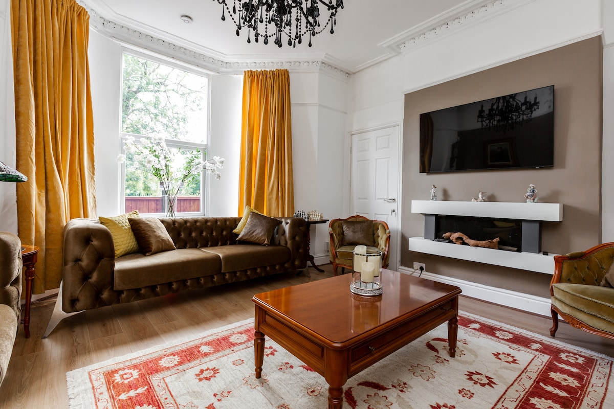 Unik victoriansk villa i det centrale Liverpool foran Newsham Park! Med: 🏡 Seks soveværelser hver med privat badeværelse 🚗 Privat parkering til 3 biler + gratis parkering på gaden. 🚻 To sociale toiletter 🛁 Luksuriøs SPA med boblebad og brusebad 👩🍳 Grill i baghaven 🍽️ Moderne køkken med morgenmadslokale og ø 📍 Kun ti minutter fra centrum ✨ Store og rummelige stuer og spisestuer 🎬 Rummeligt biografrum 🧺 Vaskerum med to vaskemaskiner og en tørretumbler