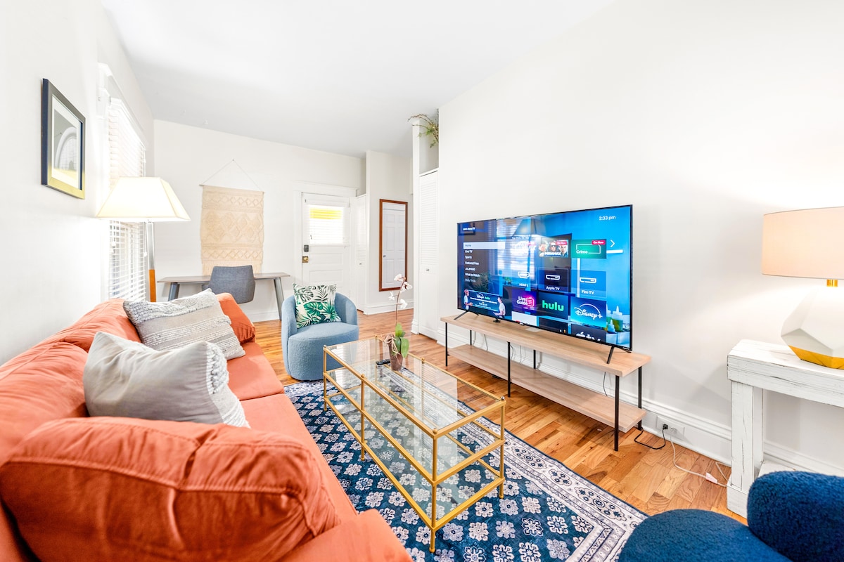 Synk ned i safirblå fløjlsofaer ved pejsen i denne designerhytte i Midtvesten. Åbent koncept stue flyder til kokkens køkken og gårdhus spisning under fantastiske kobber vedhæng. To rolige soveværelser med førsteklasses sengetøj, komplet vaskeri, spa-inspireret bad. Slap af på den overdækkede veranda med stenstolper, eller udforsk Strawberry Hill. Privat parkering, smart-tv i hele boligen, kort afstand til SplitLog Coffee. Moderne komfort møder håndværksmæssig charme. Kæledyrsvenligt. Din perfekte smuttur til Kansas City