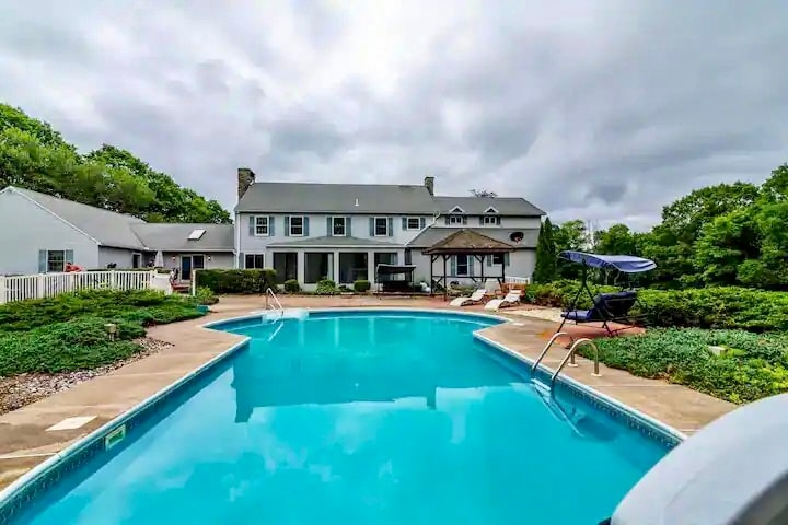 Large secluded home with 44' pool, hot tub, and gym on 32 acres. There are 6 bedrooms, 2.5 bathrooms, and a recreation room with Foosball, Ping Pong, Mega Chess, Giant Jenga, and Giant Connect 4. Separate entertainment/bar area. Large master bedroom with master bath with whirlpool tub. 5 acres of lawn, 2 Laundry rooms. Full kitchen. Perfect for family stays. The pool has a large shallow end that is great for kids. Nice remote area for watching the stars at night. Very quiet and peaceful!