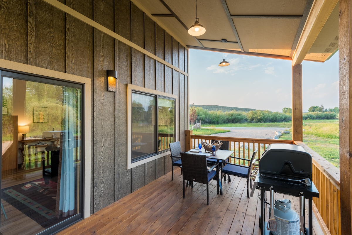 Riverbend-hytten blev bygget i 2020 på bredden af Pine Creek. Det åbne opholdsområde har et tv, siddeområde, gaskamin, murphy-seng, lille spiseområde og et fuldt udstyret køkken. Det største soveværelse har en kingsize-dobbeltseng og et lille skab. Den store overdækkede bagterrasse er det perfekte sted at nyde et måltid eller bare slappe af og nyde udsigten. Vi er lige uden for bygrænsen, men meget tæt på byen. Nyd freden og roen, mens du er tæt på alt, hvad Pinedale har at tilbyde!