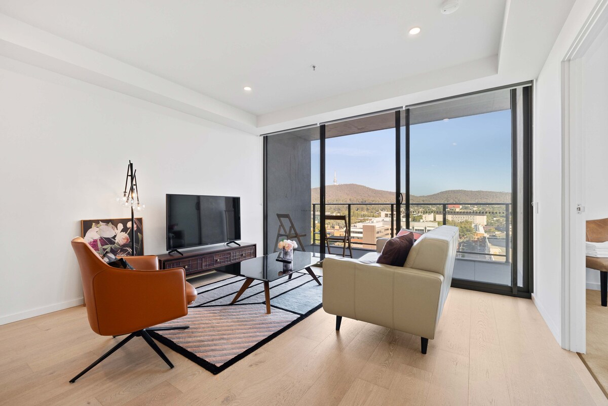 Denne lejlighed ligger højt i Canberras højeste bygning og tilbyder betagende udsigt over søen, 2 private soveværelser og 2 parkeringspladser. Det store soveværelse har panoramaudsigt over søen, mens det andet har adgang til altan. Fra balkonen kan du nyde udsigten over bjergene, fantastiske solnedgange og en fredfyldt udsigt over poolen i haven. Sky Garden på 23. etage med grill. 5. sal: Pool, sauna og FITNESSCENTER. Få skridt fra spisesteder ved søen og parken. Direkte busser til City, ANU, GIO Stadium og AIS. Nem adgang til UC og Westfield.