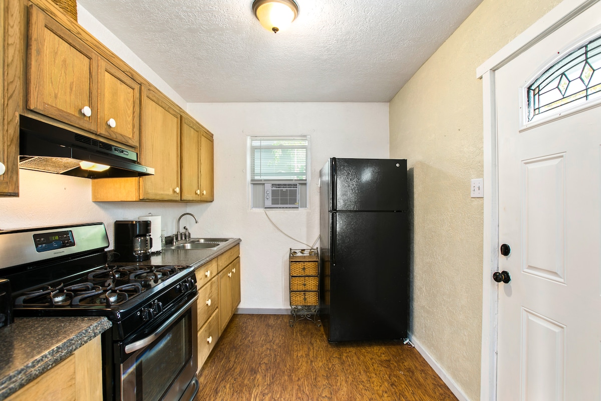 Enjoy a restful stay in our cozy one-bedroom mother in-law house. Curl up by the free-standing gas fireplace with a good book, or bask in the outdoor oasis equipped with a hot tub, a patio table and chairs, a barbecue, and a Coca-Cola machine. Inside, relax in the air-conditioned bedroom with a comfortable bed. This city haven guarantees you all the amenities of home and a peaceful getaway. Come stay with us and experience the ultimate in relaxation and comfort!