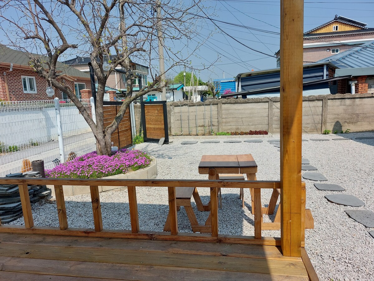 Det er et Hanok Private House i en afsides landsby. Det anbefales til dem, der ønsker at tilbringe en rolig tid med familie eller elskere, eller til dem, der har brug for en pause eller helbredelse alene. Du kan se bjergene om dagen og stjernerne om natten. Antallet af gæster, der kan overnatte, er to, og højst fire personer (der pålægges yderligere personer). Familiegæster, der ønsker at ledsage deres børn eller forældre med mere end fire personer. Send os en besked. Vi giver dig besked, hvis det er muligt. Hvis du forbereder en futon til spædbørnsgæster, kan I bo sammen uden ekstra omkostninger. Sengetøj er altid nyvasket. Vi tilbereder økologisk bomuld, mineralsk træ og rene bomuldsprodukter. Du kan lave mad i huset. Men undlad at tilberede mad med stærk lugt indendørs. Hvis du fortæller os det på forhånd, kan du grille udendørs. (Der er ingen ekstra omkostninger, og kul og grill skal tilberedes af dig selv.) Vi tilbereder bønner af høj kvalitet og avanceret rejse. Du kan nyde drypkaffe og forfriskninger i haven, som min mor dyrker.