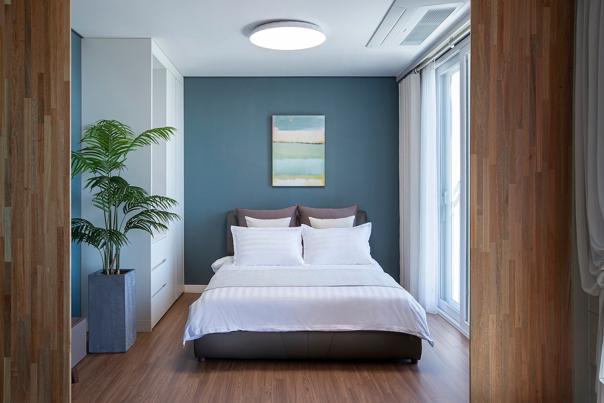 Florida Daetan (1. sal - 14 pyeong, 2. sal - 21 pyeong, 3. sal - tagterrasse) ligger lige foran den rolige Daetan Beach, 10 minutter fra Youngdeok IC, så du kan nyde havbadning og havudsigt. Der er en Daetan bølgebryder, så det er en privat pension med en score på 5,0, der er optimeret til fiskeri. Du kan nyde en fantastisk solopgang i stuen, og du kan nyde romantik, afslapning og grillfest, mens du lytter til den åbne udsigt over Det Østlige Hav og lyden af bølger fra tagterrassen på tredje sal. Der er Youngdeok Haemaji Park, Forest Ecology Culture Park, Blue Road B Course, Ocean View Cafe (Boom, Move On, Reef Forest) i nærheden, og der er Chuksan Port og Gangu Port, 15 minutter væk med bil, så det er perfekt til at nyde en række mad. For ❤ reservationer på❤ 2 nætter eller mere (10% rabat), bedes du kontakte os separat (O5O7-1354-9964). Reservationen af boligen på skærmen, du ser, svarer til hele 1., 2. og 3. sal (6-10 personer), og 1. sal - 14 pyeong (2-4 personer), 2. sal - 21 pyeong (4-6 personer) boligen drives også separat, så du kan søge efter værtens andre boliger og reservere.