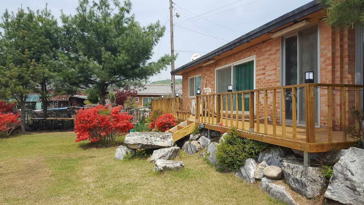 Denne enfamiliebolig er blevet renoveret fra et toetagers hus, og du kan nyde atmosfæren i en feriebolig. Fordelen er, at kun et team kan booke om dagen. Beliggenhed/transport: Det ligger 15 minutters gang fra Sungnisan Intercity Bus Terminal og 3 minutters kørsel. Det grundlæggende taxegebyr på 4.000 won er 5 minutters gang væk, og der er en dal med en træskygge, der er ideel til børn at lege i vandet. Faciliteter: Rummelig terrasse, parasol, kulgrill (kul tilberedes, og der opkræves ikke ekstra) Soveværelse: 1 værelse med queensize-dobbeltseng, badeværelsestoilet i hvert rum, hårtørrer, håndklæde, shampoo, tandpasta, sæbe, toiletpapir Køleskab, mikrobølgeovn, kaffemaskine, riskoger, service, kopper, skeer og spisepinde, vinglas. Spiselig olie, salt, sukker sightseeing: Der er en indgang, hvor du kan bestige den juridiske indsprøjtning, Sejogil, Sejogil og Cheonwangbong Peak inden for 10 minutters gang. *Op til 10 personer til stuen. 20.000 won for en ekstra person. En hund er gratis. 10.000 won per ekstra hund. Men for mere end 10 kg vandt 20.000 uden gratis. *Indtjekning: kl. 15.00 Udtjekning: kl. 11.00 * Justerbar *