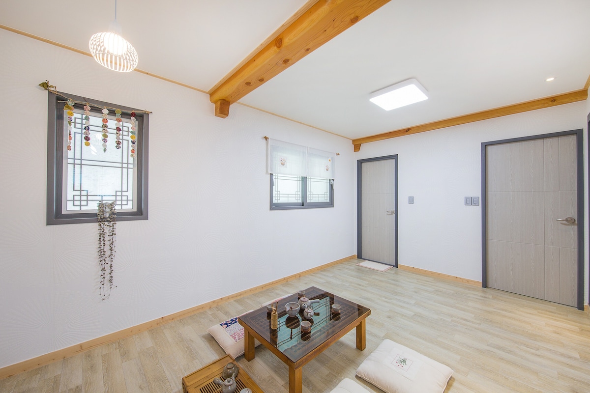 Hej, vi er Onda, der forsker og tilbyder forskellige hvileområder. Vi håber, at alle, der vil bo her, får en behagelig og glad tid. [Indkvarteringsindledning] En fyrreskov, der præsenterer 5.000 pyeong af ren luft, der udnytter stilen i en hanok. Det er et rummeligt og behageligt sted, hvor du kan dele minder med særlige mennesker, og individuelle bygninger tilføjer bekvemmelighed og funktionalitet. [Værelsestype] Separat type: stue + køkken + ondol værelse A (1 futon) + 2 badeværelser