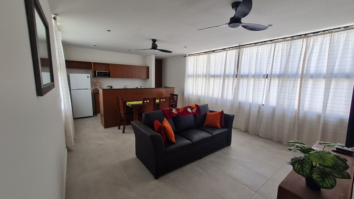 Velkommen til dit tilflugtssted i Temozón Norte, et af de hurtigst voksende områder i Mérida, der stadig bevarer sin ro og sit naturlige miljø. Vores lejlighed med et soveværelse er ideel til afslapning og nydelse: Den har en kingsize-seng, et skab, et privat badeværelse og en behagelig dobbelt sovesofa i stuen til ekstra gæster. Nyd din egen private pool på terrassen, eller drag fordel af bygningens faciliteter såsom fitnessrum, fælles pool, kæledyrspark og eventlokale.