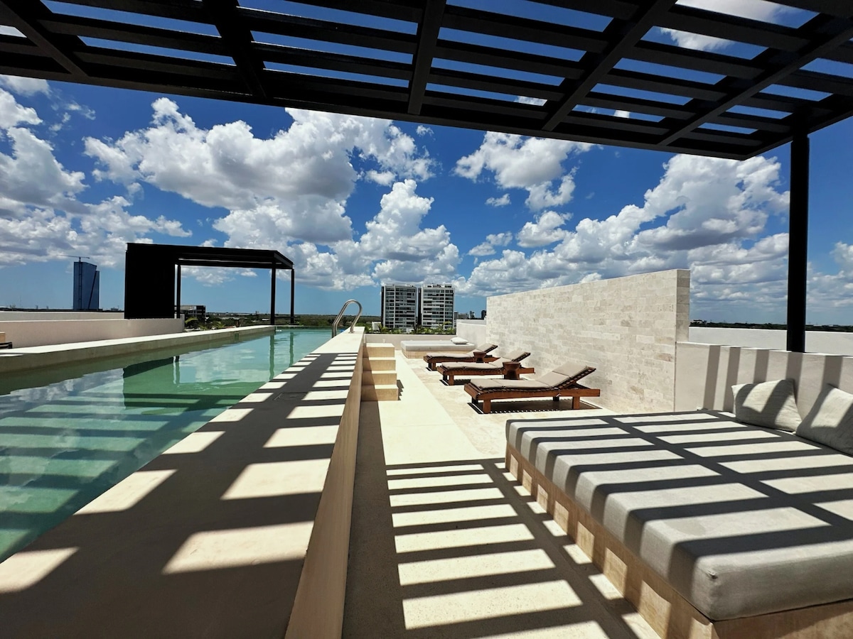 Discover our modern smart one-bedroom apartment, ideal for 2 guests and up to 4. It features a fully equipped kitchen, 1.5 bathrooms, living and dining area. Just say “OK Google” to control the TVs, fan, air conditioning and music. Located in Bosqüa, a private complex near downtown Mérida with easy access to Puerto Progreso. Perfect for remote work. Self check-in from 3 pm and 24/7 security for your peace of mind.