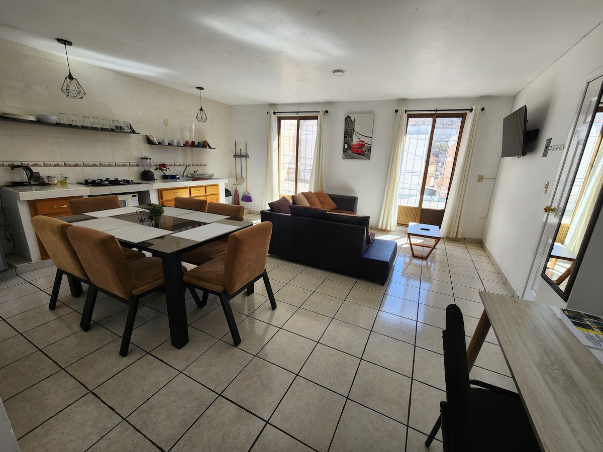 Luksuriøs lejlig lejlighed til op til 8 personer, inklusive privat parkering inde i bygningen. Den har 3 soveværelser med dobbeltsenge, 2 komplette badeværelser, udstyret køkken, spisestue, stue med smart-tv og sovesofa. Vores bolig har en fantastisk udsigt over Cerro de La Bufa. Beliggende 10 minutter fra det historiske centrum i bil. Derudover ligger lejligheden kun 2 gader fra en vej, hvorfra du hurtigt kan komme til ethvert punkt i byen Zacatecas.