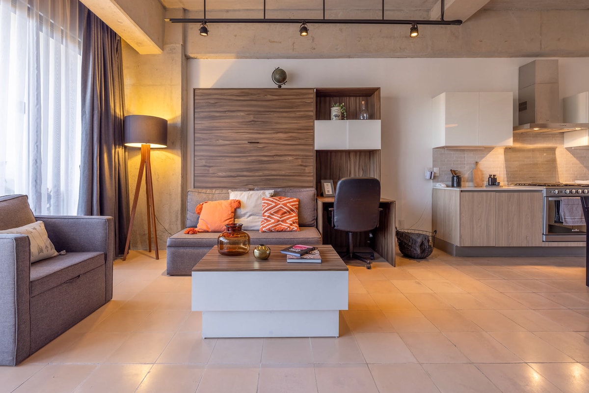 Juega al futbolito e inspírate del arte que llena las paredes de este loft de estilo contemporáneo. El hormigón le pone el sello a este departamento y se combina a la perfección con mosaicos y muebles. Es cómodo e ideal para recorrer la ciudad a pie. Tiene una terraza desde la que se aprecia maravillosa vista de la zona. El edificio tienen cámaras de vigilancia y seguridad en la entrada, puedes estar tranquilo al salir a conocer