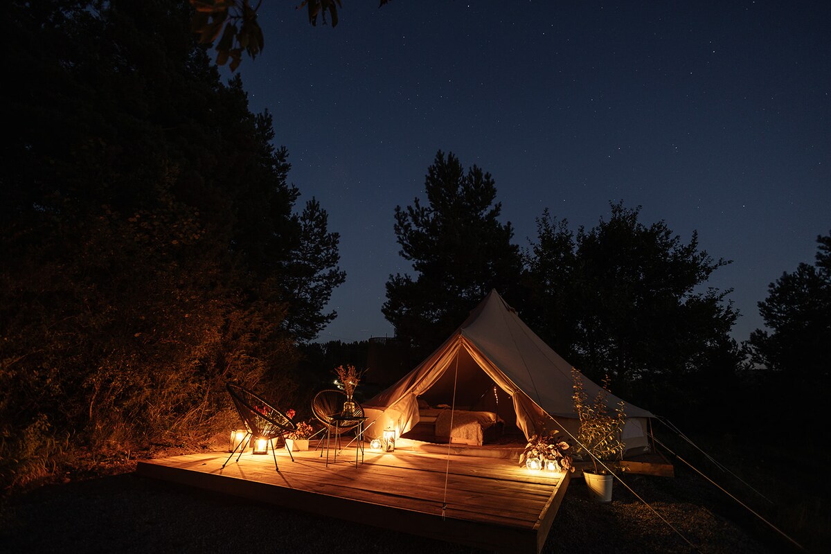 TELT OPVARMES MED GASKOMFUR I VINTERMÅNEDERNE Book begge telte, hvor du er vært for op til otte gæster til en familieferie, fejring, fødselsdag, polterabend eller tilflugtssted for venner. Nyd den betagende udsigt over dalen og fascinerende solnedgange. Oplev perfekt belysning med sol udendørs og batterilamper inde i de hyggelige telte. Fordyb dig i naturens skønhed.