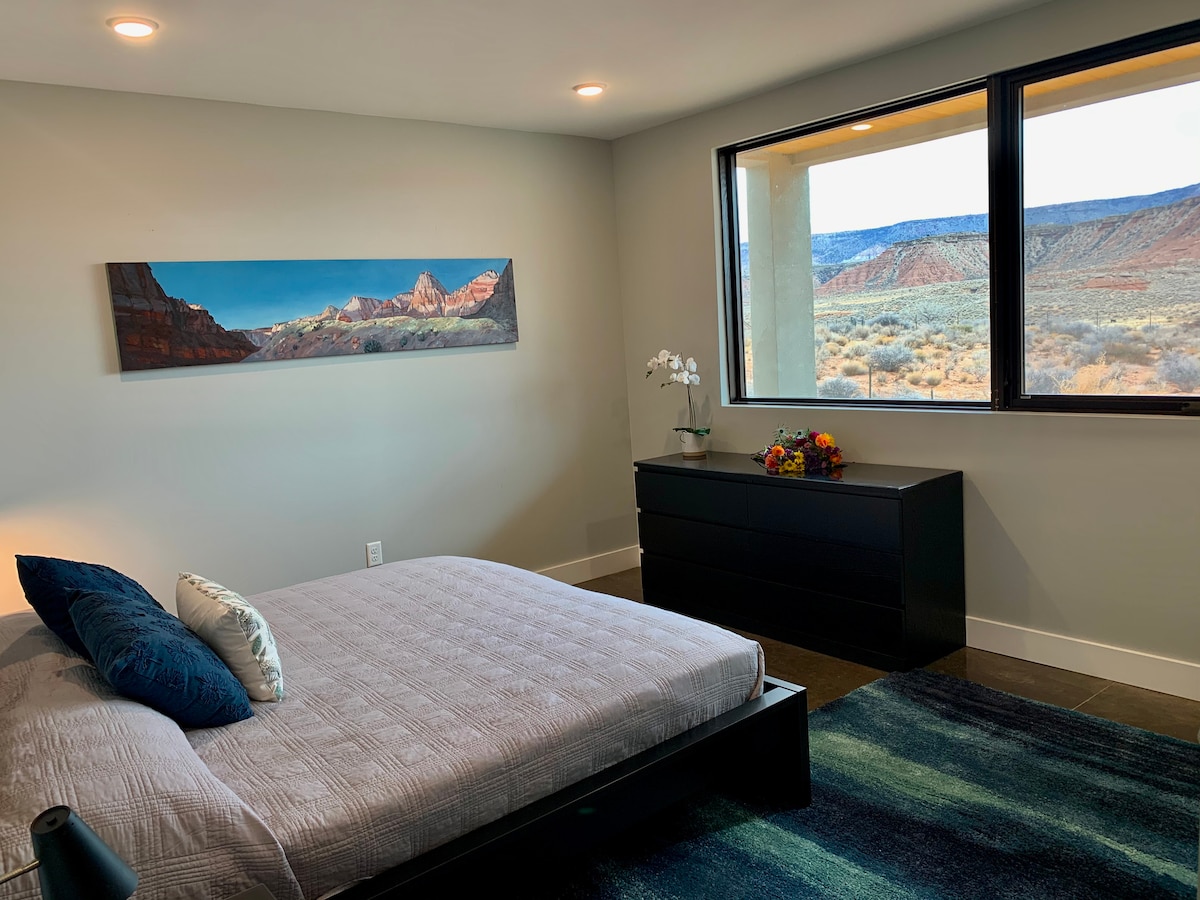 Dette er en privat, fredfyldt Virgin River-ferie med en rummelig master-suite og badeværelse. Du vil være 15 minutter fra Zion National Park og 5 minutter fra mange mountainbike- og vandrestier. Bo på det perfekte sted for at få adgang til alt, hvad området har at byde på, uden folkemængder, trafik og støj. Suiten har egen indgang, veranda, kingsize-dobbeltseng og et unikt og rummeligt badeværelse med dobbelt brusehoved. Lyt til floden om natten, og nyd denne oase i ørkenen.