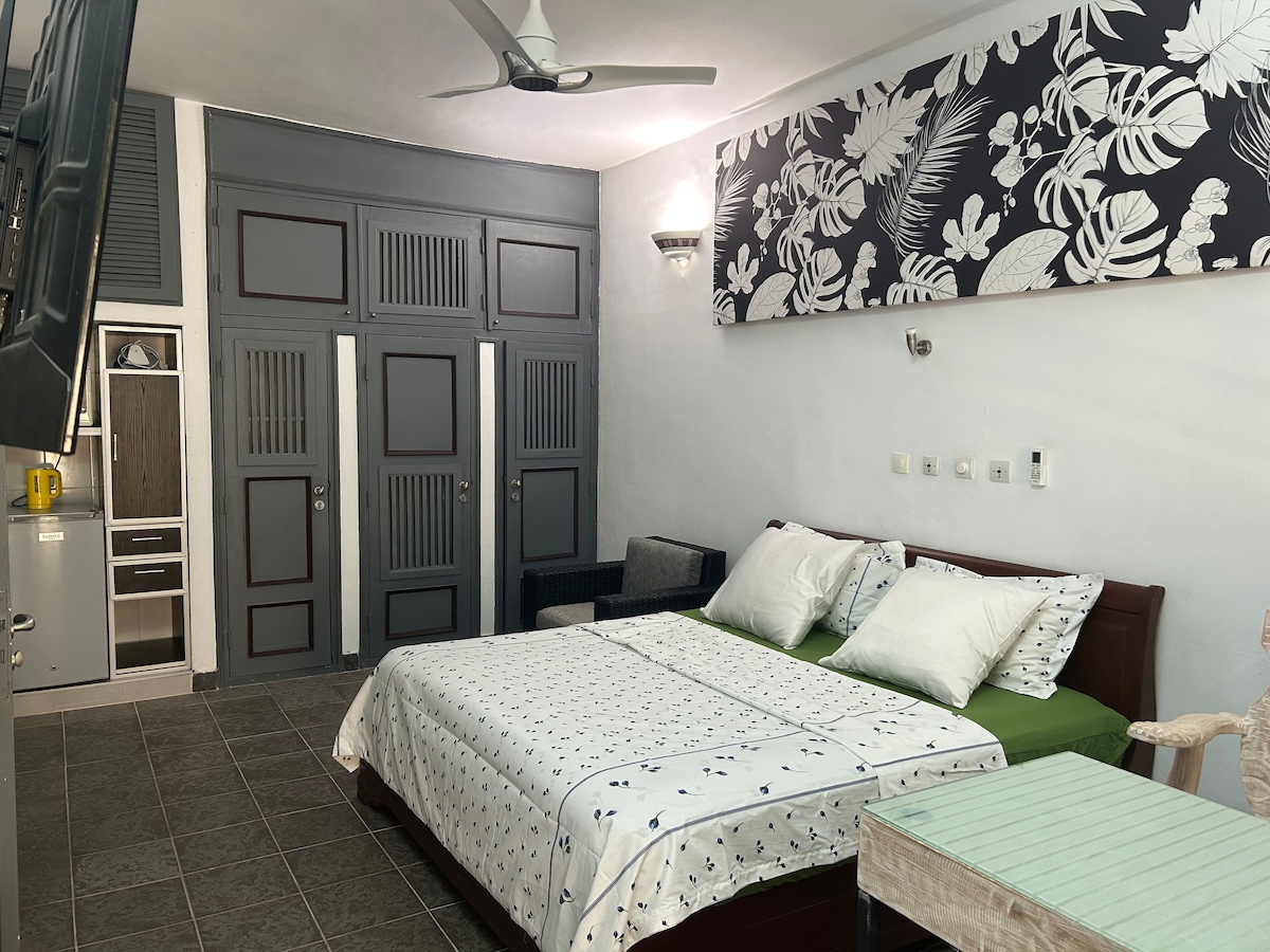Dette er et roligt studio-værelse, meget behageligt, komfortabelt og udstyret. Det er beliggende i en lille moderne og moderne bolig i hjertet af Biétry Zone 4, et af de sikreste kvarterer i Abidjan, 10 minutter fra lufthavnen og den franske base 43rd BIMA.