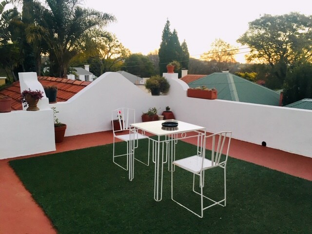 Vores private gæstesuite ligger i en smuk have i den løvfulde forstad Saxonwold. Det er en fantastisk beliggenhed med nem adgang til motorvejen og gåafstand til Rosebank-butikker og restauranter. Gæstesuiten er knyttet til hovedhuset, men har egen indgang og sikker parkering i indkørslen. Gæsterne kan slappe af i den private gårdhave med udsigt over rosenhaven og fuglefoderautomaterne.