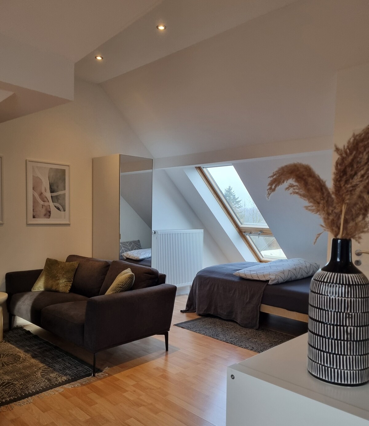 Vi tilbyder to fuldt møblerede lejligheder af høj kvalitet og identisk møbleret på vores loft. Disse har et soveværelse med en enkeltseng (90 cm x 200 cm), et køkken/stue og et badeværelse med toilet. Ruhr University, German Lawyers Institute (Vita Campus), BioMedizinpark (IFK, Aesculap Academy) kan nås til fods på 10 til 15 minutter.