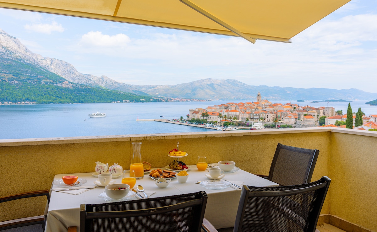 Dette er en moderne 2-værelses lejlighed med 2 små terrasser med fantastisk havudsigt og udsigt over den gamle bydel. Beliggende få minutter væk fra alle de vigtigste begivenheder i Korcula. Fantastisk base for dit ophold. Komfortabel, fuldt udstyret. Begge soveværelser har deres egen aircondition. Denne rummelige lejlighed er velegnet til en til fire personer. Enten en familie eller to par. Den ligger på anden sal i dette typiske middelhavshus. Der er en privat garage til parkering, men du skal kontakte mig på forhånd.